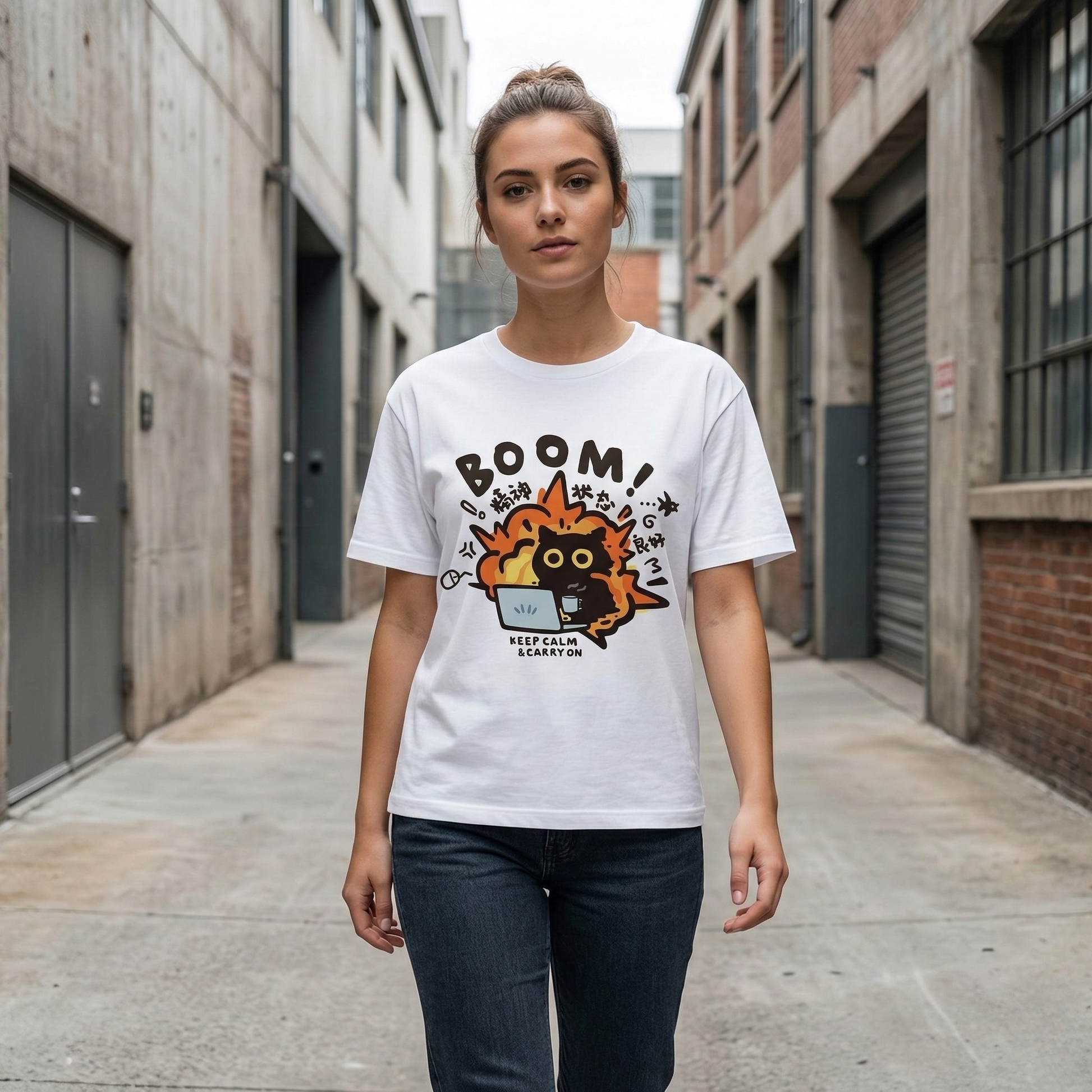 Inspirado en esa mezcla de calma exterior y mente activa, el diseño de esta pieza captura un momento caótico con un toque de humor: un gato frente a su computadora mientras todo parece explotar a su alrededor. Dentro de la colección Baseline, esta gráfica representa esa dualidad moderna entre serenidad y caos cotidiano, conectando la personalidad observadora del Chartreux con una estética urbana y contemporánea que destaca dentro del streetwear.
